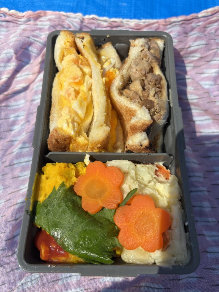 サンドイッチはくしゃくしゃになってしまって、ちょっと失敗してしまったけど、なんとかお弁当としてできましたね。クッキー作る用にさくらの型抜き持ってたんでにんじんをさくらにしました。この型抜き他にも松とかもあるしなんか変だと思ってたところ、お吸い物用の和風型抜きであることが後々判明してしまった過去があります。^v^ それでクッキー作ったことありますけども。おいしかったよ。当時おそ松さん流行ってたので、松クッキーつくったなあ。